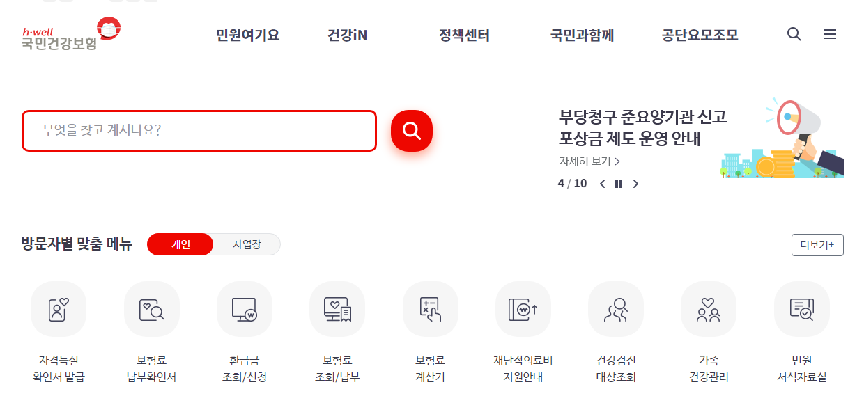 이럴 때 사용하는 곳이 국민건강보험홈페이지로써 접속 후에 다양한 민원서비스를 확인하고 이용이 가능합니다. 특히 건보료관련된 내용은 계산기, 조회/납부, 환급금 신청 등 다양하게 이용 가능합니다.