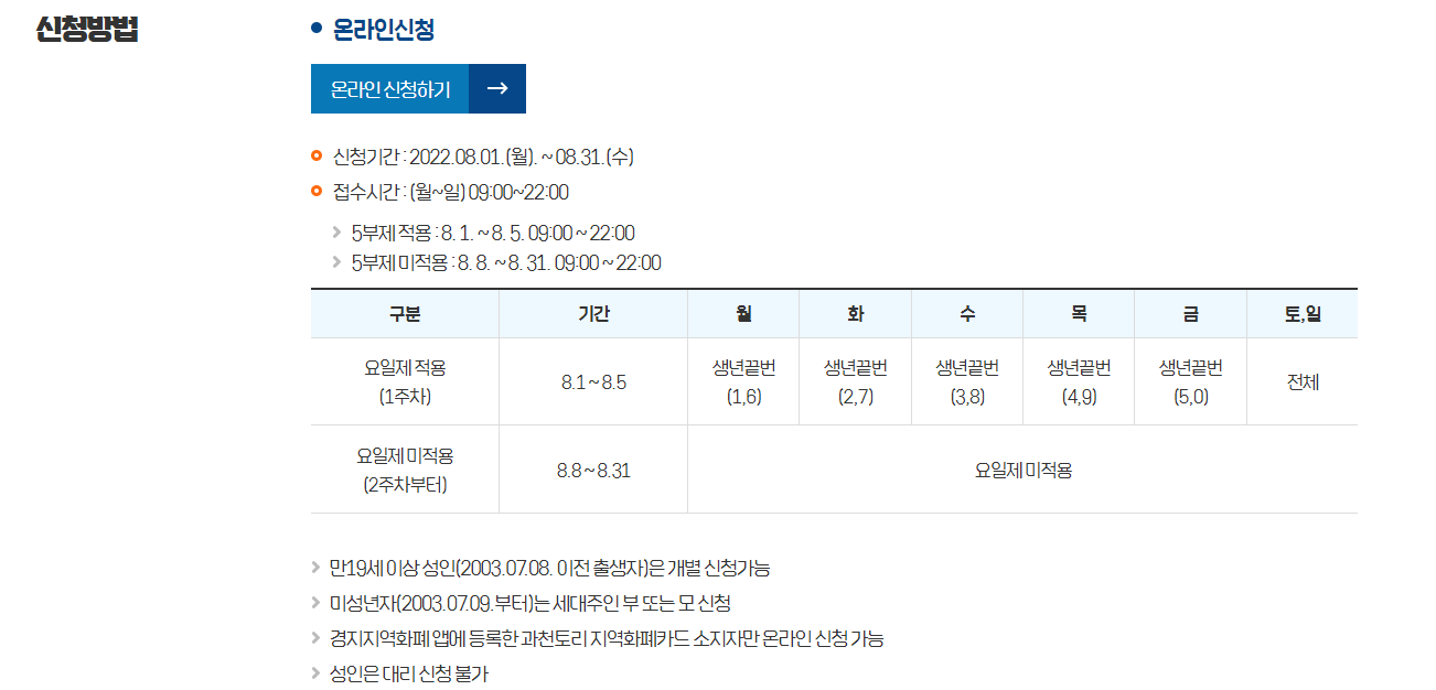 온라인 신청 및 방문접수는 8월 31일까지 진행되어 얼마 남지 않았습니다. 잘 확인 후 빠르게 신청 진행해보세요. 지급액은 1인당 10만원으로 과천토리 지역화폐카드로 지원된다고 하구요.