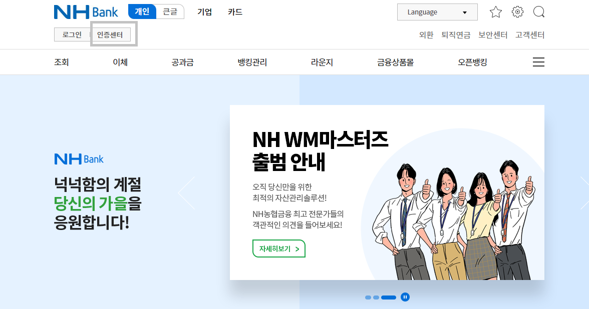 그럼 간편하게 인증센터를 이용하여 인증서 마련하시고 인터넷뱅킹 서비스로 농협은행의 다채로운 서비스 온라인으로 이용해보세요.