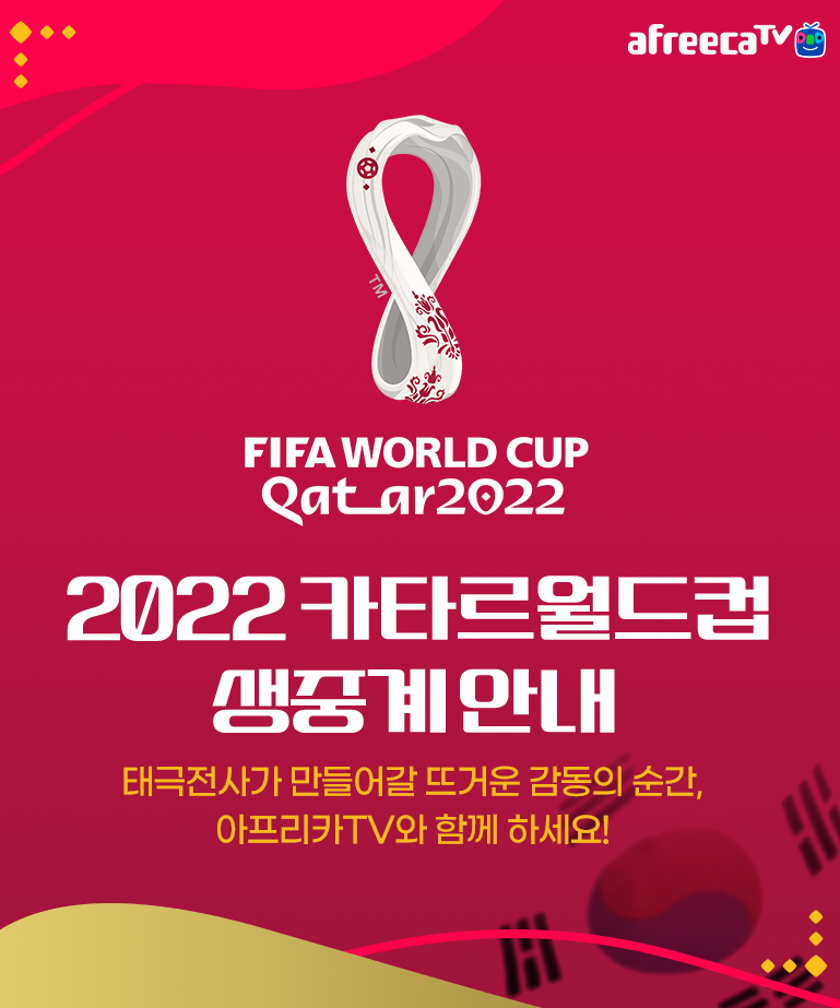 코 앞으로 다가온 월드컵 경기 한국 경기 뿐 아니라 전경기를 볼 수 있는 기회 아프리카를 통해서 월드컵 축구 중계방송 재미있게 시청해보세요.