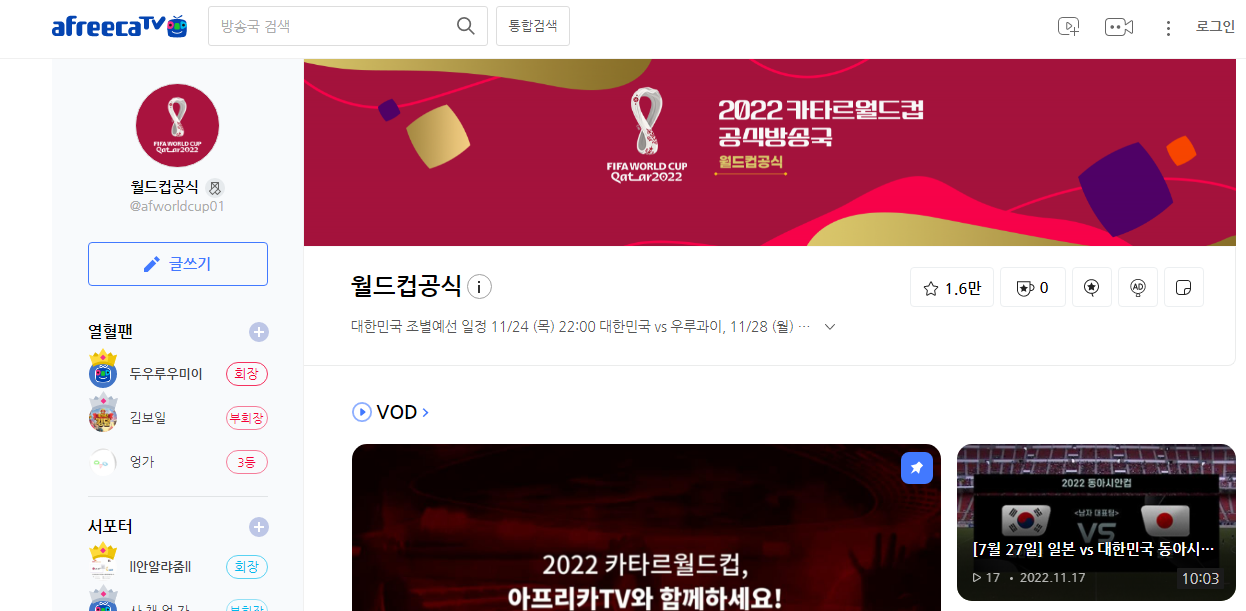 아프리카 TV에서는 PC와 모바일에서 월드컵 경기를 라이브와 VOD로 보실 수 있도록 서비스를 제공합니다. 유명 BJ와 선수들이 방송을 진행하여 응원을 한다고 하니 함께 시청을 하신다면 재미있게 보실 수 있을 것 같습니다.