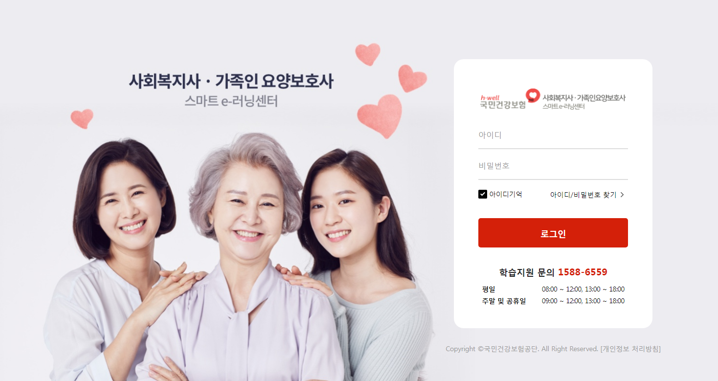 사회복지사 가족인 요양보호사 스마트 e-러닝센터에서는 장기요양기관종사자를 대상으로 온라인교육을 진행하고 있습니다.