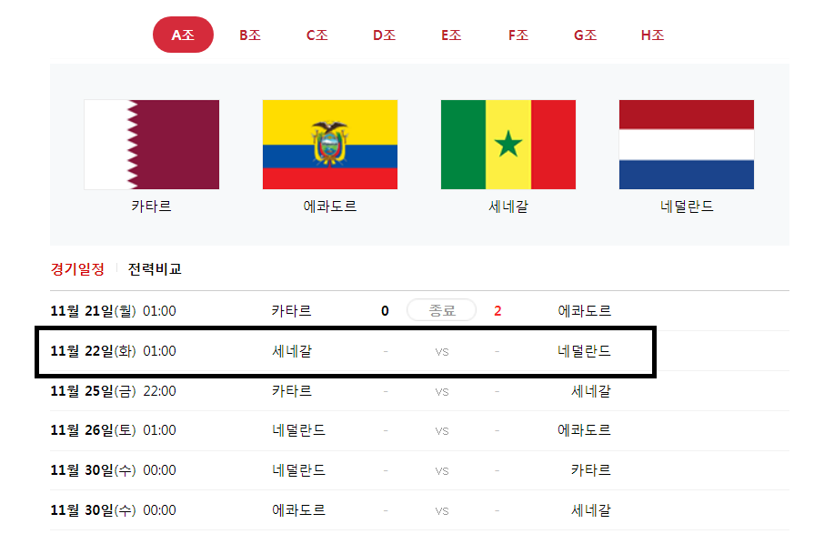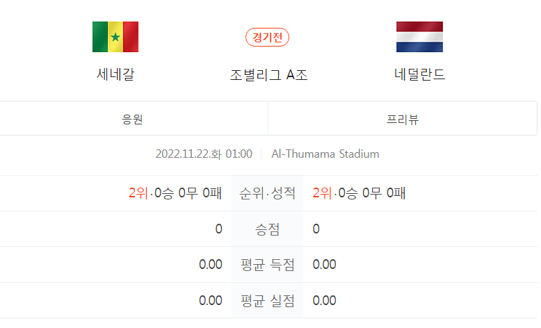 전력상으로는 A조에서는 세네갈과 네덜란드가 16강에 진출을 할 것으로 예측을 하고 있는데요. 이번 11월 22일 화요일 오전 1시에 진행되는 경기 결과가 조 1위에 중요한 역할을 할 것으로 보입니다.