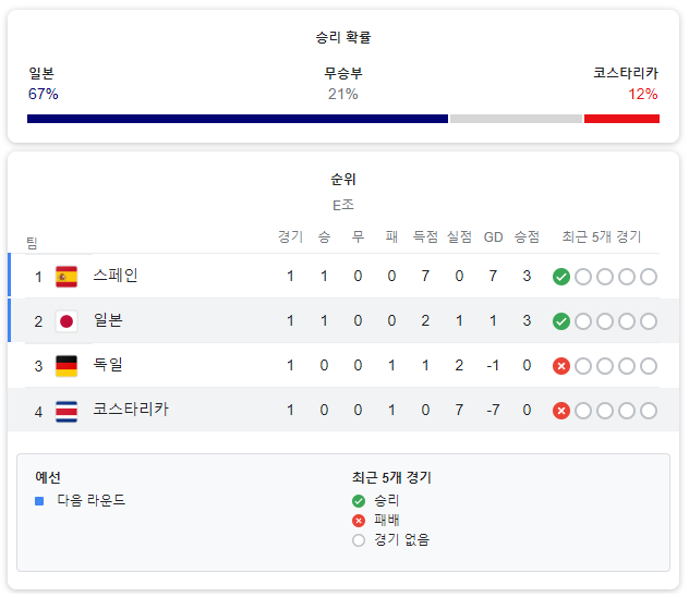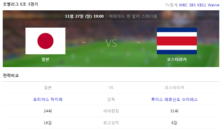 지난 독일전 때문이라도 일본축구에 대한 관심도가 많이 올라간 현 시점인데요. 과연 이번 매치에서 일본이 승리하여 16강 확정을 빠르게 할 수 있을지 관심을 가지고 지켜봐보세요.