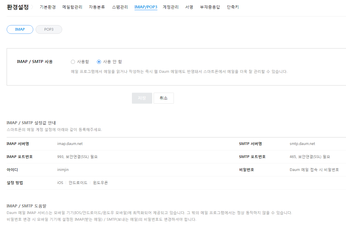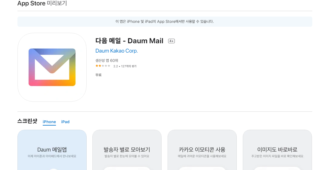 그러면 한메일의 이용이 가능합니다. 이외에 다음 메일 - Daum Mail 앱을 다운로드 설치 하여 이용도 가능합니다.