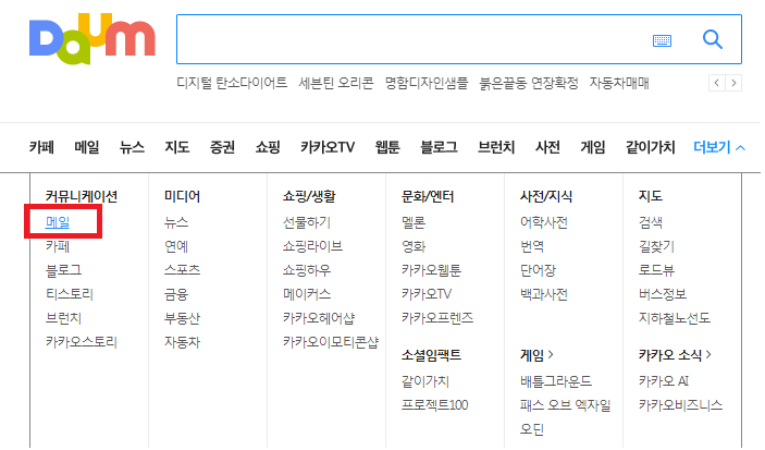 이용을 위해서는 컴퓨터에서는 홈페이지를 통해 들어가실 수 있습니다. 다음홈페이지에서 더보기를 통하여 메뉴에 들어가신 후에 커뮤니케이션 - 메일로 이동해주시기 바랍니다.