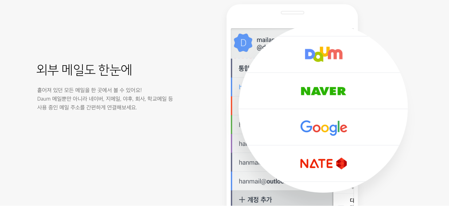 외부 메일도 한눈에 흩어져 있던 모든 메일을 한 곳에서 볼 수 있어요! Daum 메일뿐만 아니라 네이버, 지메일, 야후, 회사, 학교 메일 등 사용 중인 메일 주소를 간편하게 연결하여 'Daum 메일앱'에