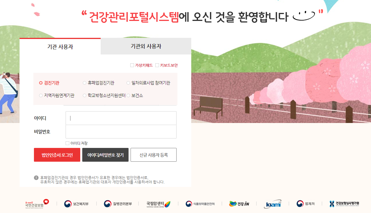 검진기관, 휴폐업검진기관, 일차의료사업 참여기관, 지역자원연계기관, 학교밖청소년지원센터, 보건소에서는 로그인을 하시고 건강관리포털시스템을 이용하실 수 있습니다.