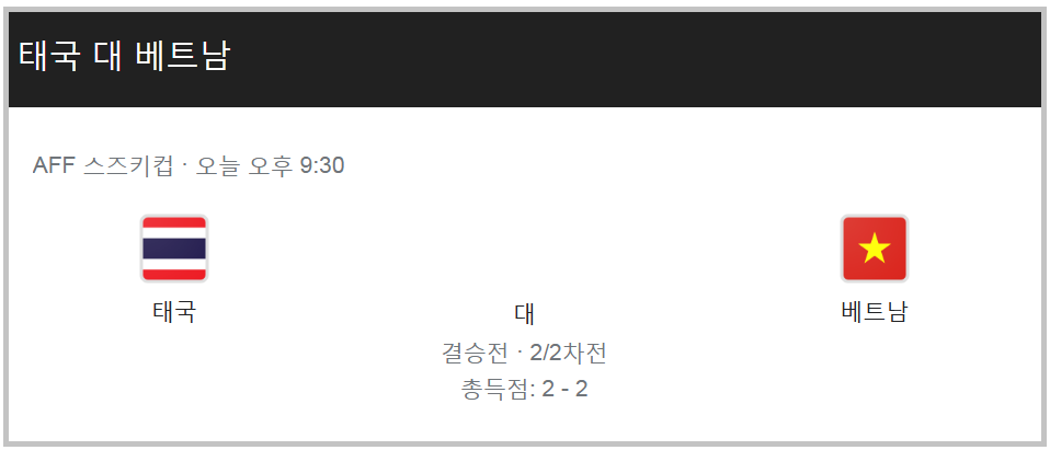 결과는 경기가 끝나는 시간대인 11시 30분 정도면 알 수 있을텐데요. 오늘이 결승전이기 때문에 최종 우승국가가 베트남이 되는지 태국이 되는지 확인이 됩니다.