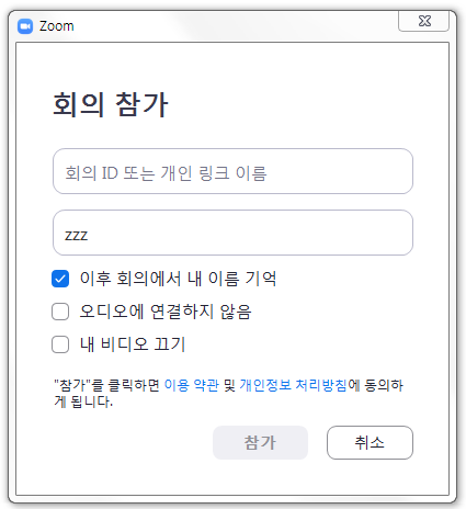 회의참가에서는 id나 개인링크이름을 넣어주시면 만들어져있는 회의에 접속이 가능합니다.