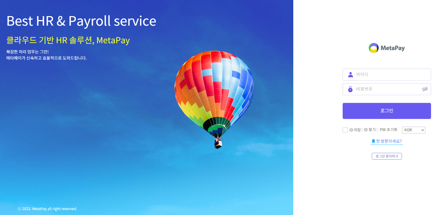 급여문제는 보안이 중요하기 때문에 로그인 과정이 필수이며, 회사를 통하여 아이디와 비밀번호 확인하시고 접속하기 바랍니다. 메타페이는 다양한 곳들과 제휴하여 급여솔루션을 제공하는 곳이기 때문에 편리하게 이용이 가능할 것 같네요.