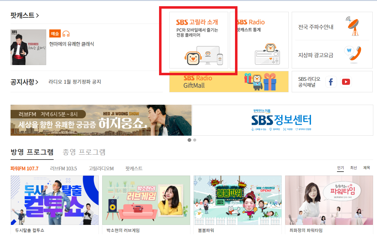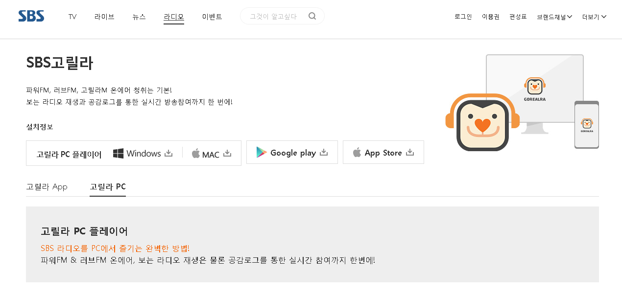 고릴라 라디오 다운받기는 SBS고릴라 PC 플레이어로써 제공되어지고 있습니다. 해당 플레이어는 sbs공식 홈페이지의 라디오탭을 통하여 확인을 하실 수 있습니다. 현재 윈도우와 맥버전으로 배포가 되기 때문에 컴퓨터 환경에 따라서 다운을 받으실 수 있습니다.